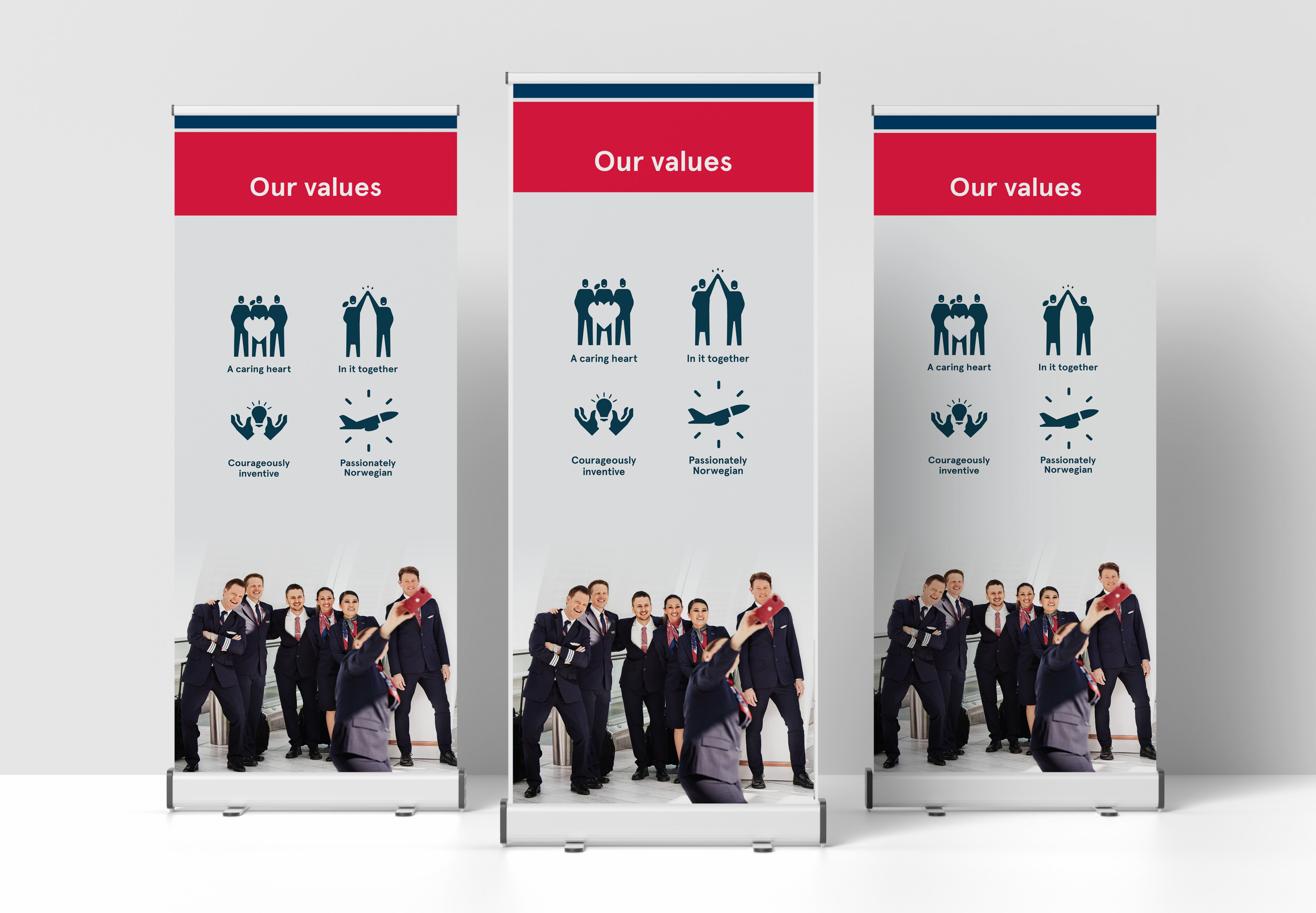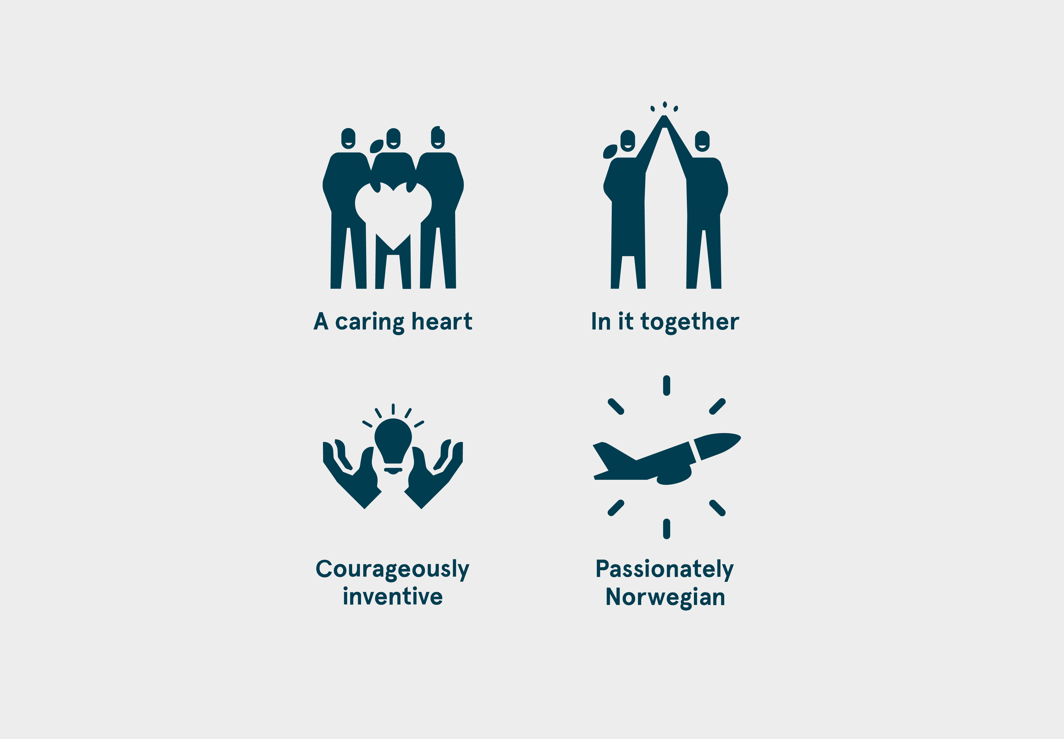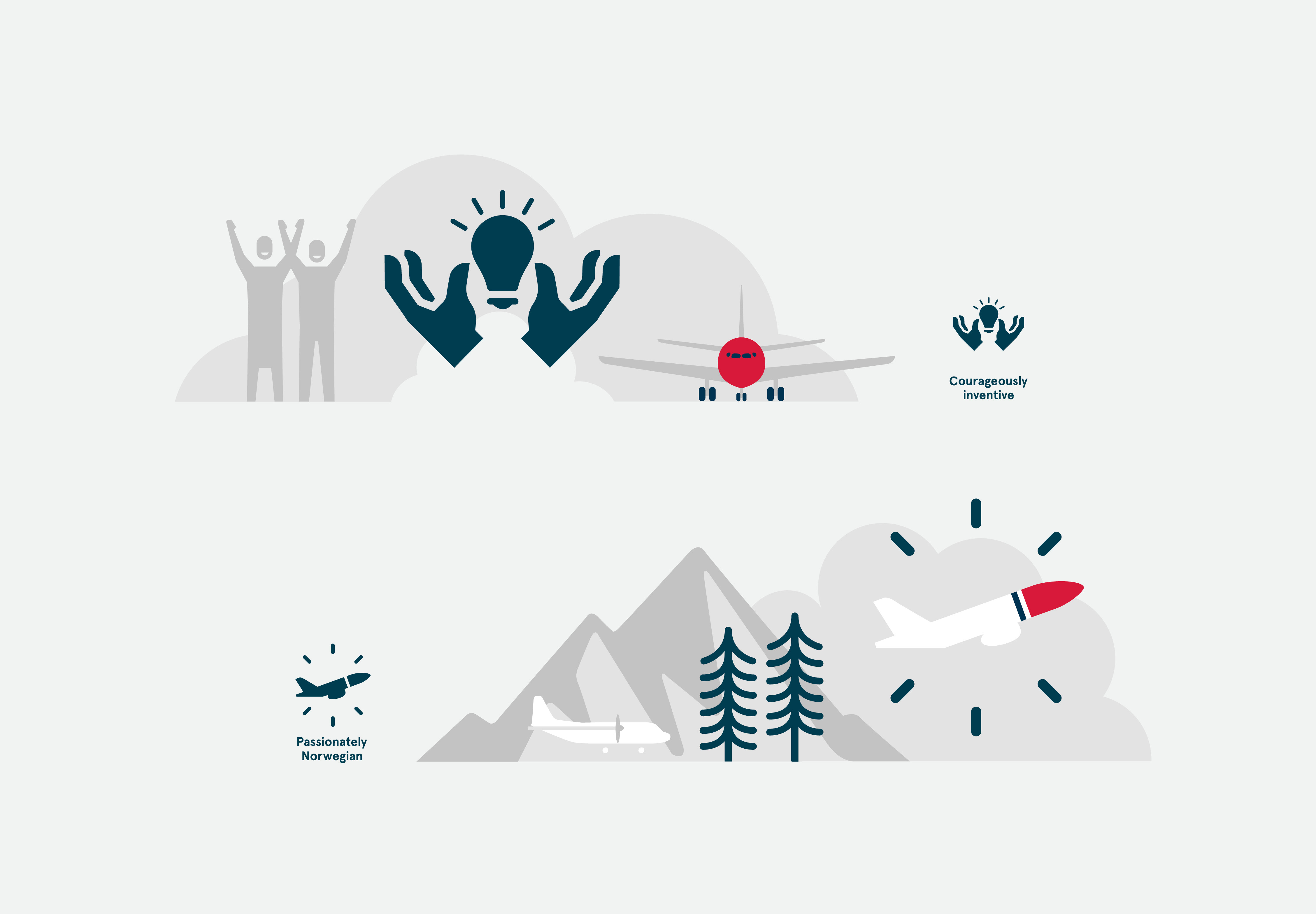 Pandemien endret strukturen i mange selskap, og da Norwegian skulle lansere deres nye visjon og verdier, fikk vi det ærefulle oppdraget å visualisere disse verdiene. I første omgang handlet dette om å lage nye ikoner og illustrasjoner for Norwegians fire verdier, lage templates for visualisering på skjermer, boards, crew rooms, vegger samt en animasjonsfilm for å presentere disse fire verdiene.